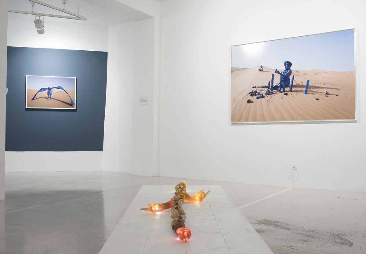 La première, Inchallah, consiste en l’entassement de mosquées miniatures bleues, en écho à un jeu de construction précaire, soulignant la fragilité de l’idéologie religieuse. Pour la seconde, Nomad, elle se fait l’étai d’une tente tribale, montée puis démontée à partir de son foulard et de piquets, rendant hommage à des conceptions alternatives de l’habiter.
