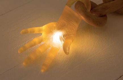 Mais c'est le recouvrement de sa relation à l'autre que Sarah Trouche trouve finalement le moyen de dépasser son traumatisme. Une pièce conçue suite de son dialogue avec la mère d'une jeune fille partie rejoindre la Syrie allie deux formes rivales de la transformation du sable : le verre et la céramique. Reliées par un bracelet de charme grand format, censé faire fuir les mauvais esprits, quatre mains dessinent une quadrature du signe investie d'une charge symbolique forte : poing levé, doigt tendu vers Dieu, signe de ralliement du djihad ou main tendue à l'autre.