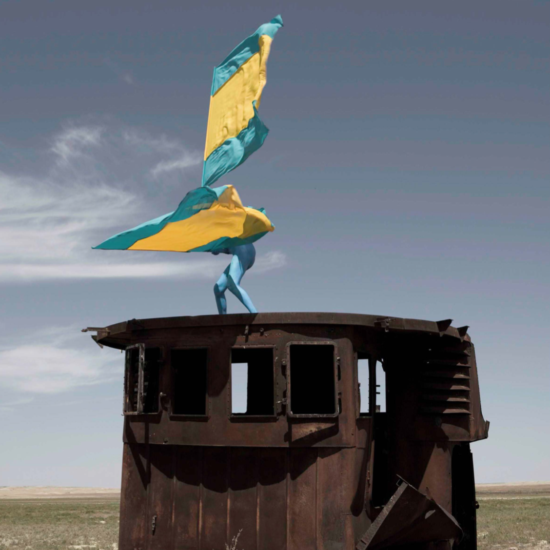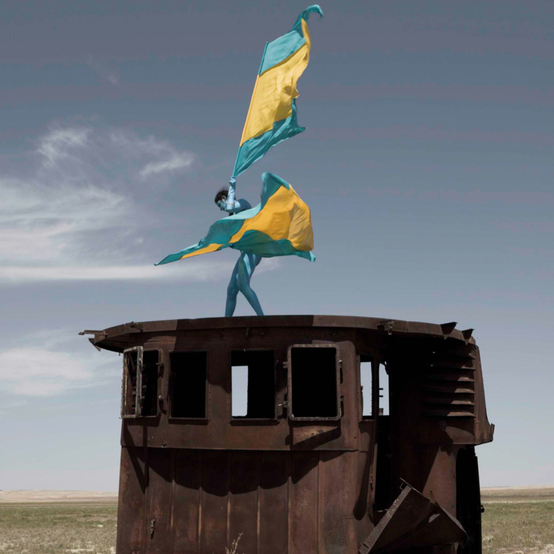 L’action (1) Aral Revival se déroule sur le pont d’ une des nombreuses épaves rouillées qui jonchent les steppes en lieu et place de l’ancienne mer. Sarah Trouche, nue et peinte intégralement en bleu porte deux drapeaux attachés à chacun de ses bras.Ces drapeaux dont les couleurs reprennent celles du drapeau Kazakh (bleu et jaune) sont détournés pour l’occasion en drapeaux de communication de la marine internationale utilisés pour communiquer par sémaphore.