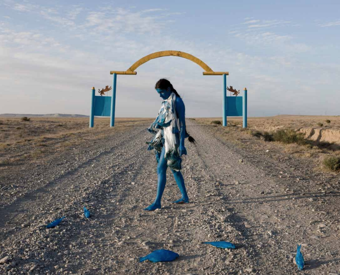 L’action (1) Aral Revival se déroule sur le pont d’ une des nombreuses épaves rouillées qui jonchent les steppes en lieu et place de l’ancienne mer. Sarah Trouche, nue et peinte intégralement en bleu porte deux drapeaux attachés à chacun de ses bras.Ces drapeaux dont les couleurs reprennent celles du drapeau Kazakh (bleu et jaune) sont détournés pour l’occasion en drapeaux de communication de la marine internationale utilisés pour communiquer par sémaphore.